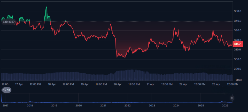 Holding above $310 keeps the short-term structure neutral-to-bullish. A breakdown below $300, however, could trigger increased selling pressure and a deeper correction toward $280.